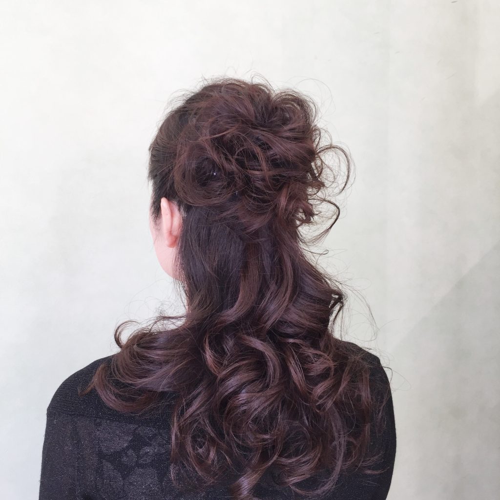 メニュー内容:ハーフアップ 全部上げないスタイル 毛先は巻いて大きいカールを出します 上半分は編み込みでまとめてもいいし、ひねって上げても大丈夫 ボリュームが出過ぎないようにカールを出していきます やりすぎない感がポイント エレガントな雰囲気です